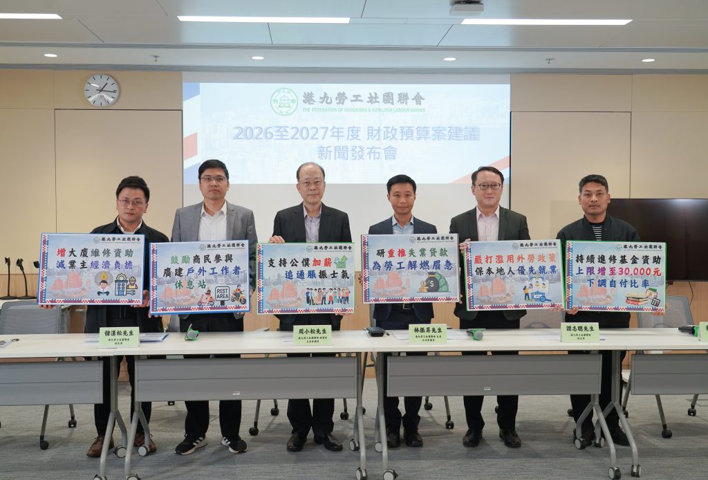 港九勞工社團聯會主席、立法會議員林振昇及港九勞工社團聯會秘書長、立法會議員周小松早前會見財政司司長陳茂波並提交《勞聯就 2026-27 年度財政預算案建議書》,就「加強支援勞工 保障優質就業」、「鼓勵多生多育 照顧家庭需要」、「建設宜居城市 紓解市民負擔」、「積極育才招才 打造人才高地」和「提振本地經濟 推動產業發展」共五大範疇提出四十五項具體政策建議。港九勞工社團聯會(下稱:勞聯)今日(5 日)召開記者會,公布及闡述各項政策倡議細節及內容。